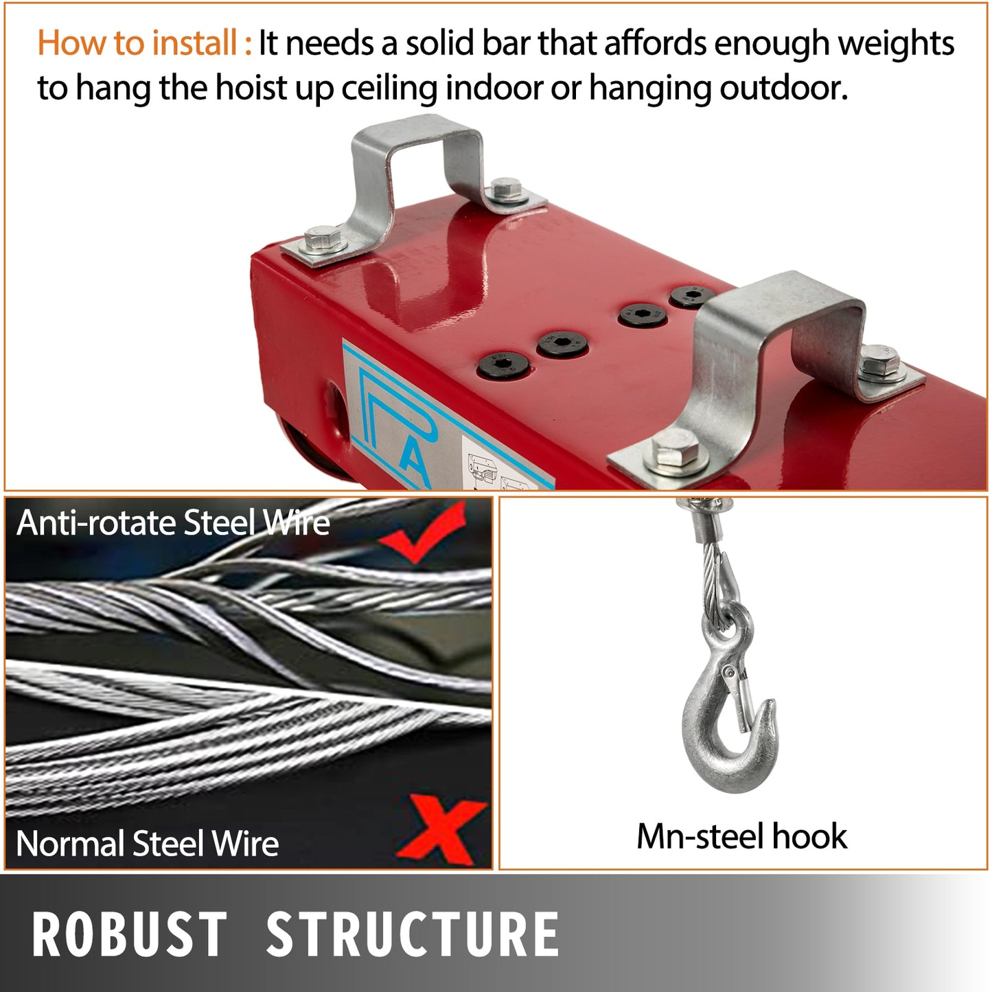 Premium Construction: Crafted with an alloy shell and galvanized steel wire, this electric hoist is engineered to resist corrosion, rust, and exposure to rain. The steel line boasts a length of 39.4 ft / 12 m and a diameter of 0.16 in / 4 mm. Furthermore, the adjustable metal fixing ring accommodates various needs and offers straightforward installation.