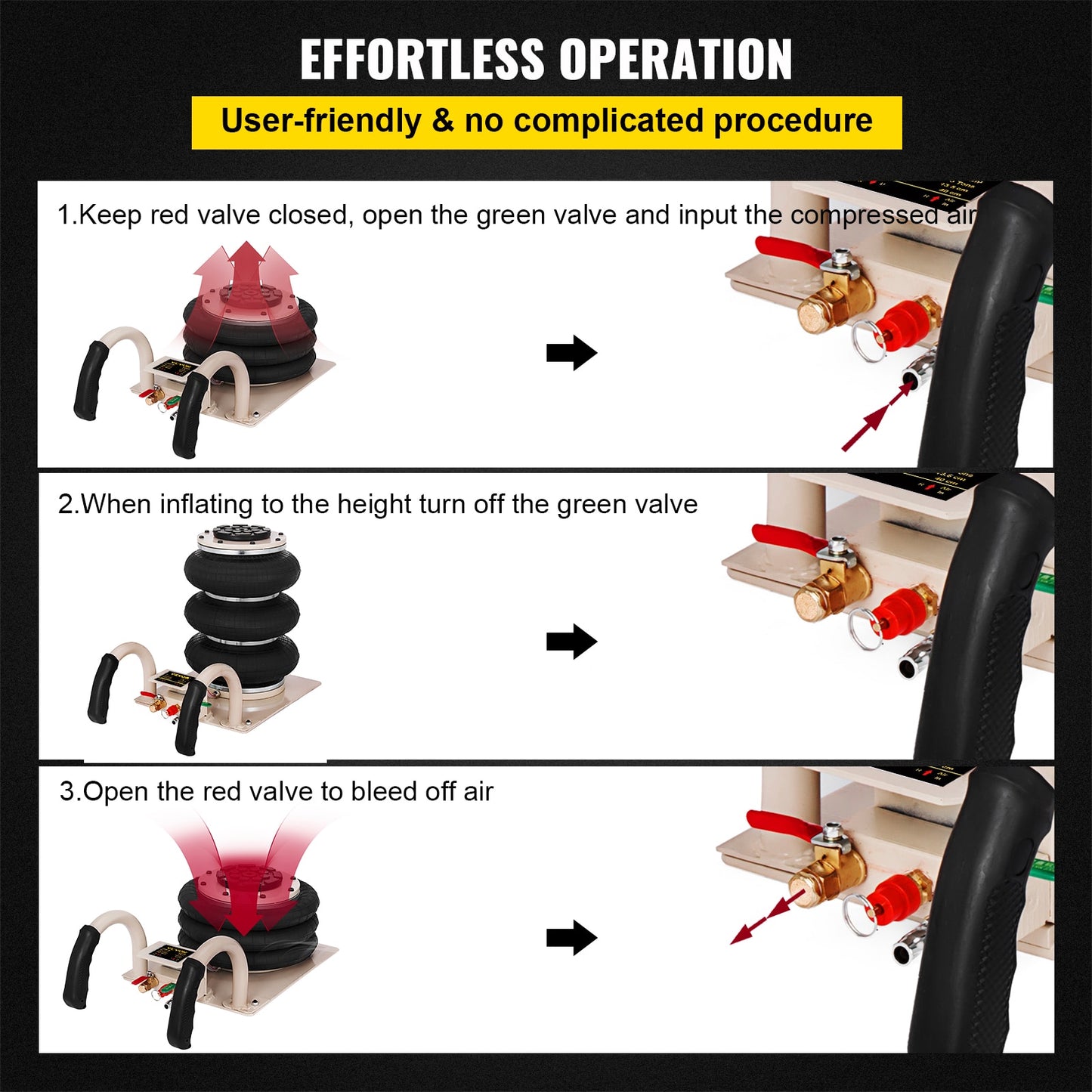 Safety Assured: Utilizing the red and green valves, this jack is simple to operate. Close the red valve, open the green valve, and introduce compressed air. Upon reaching the desired height, close the green valve. After use, release air by opening the red valve. The safety valve maintains controlled gas injection, ensuring secure usage.