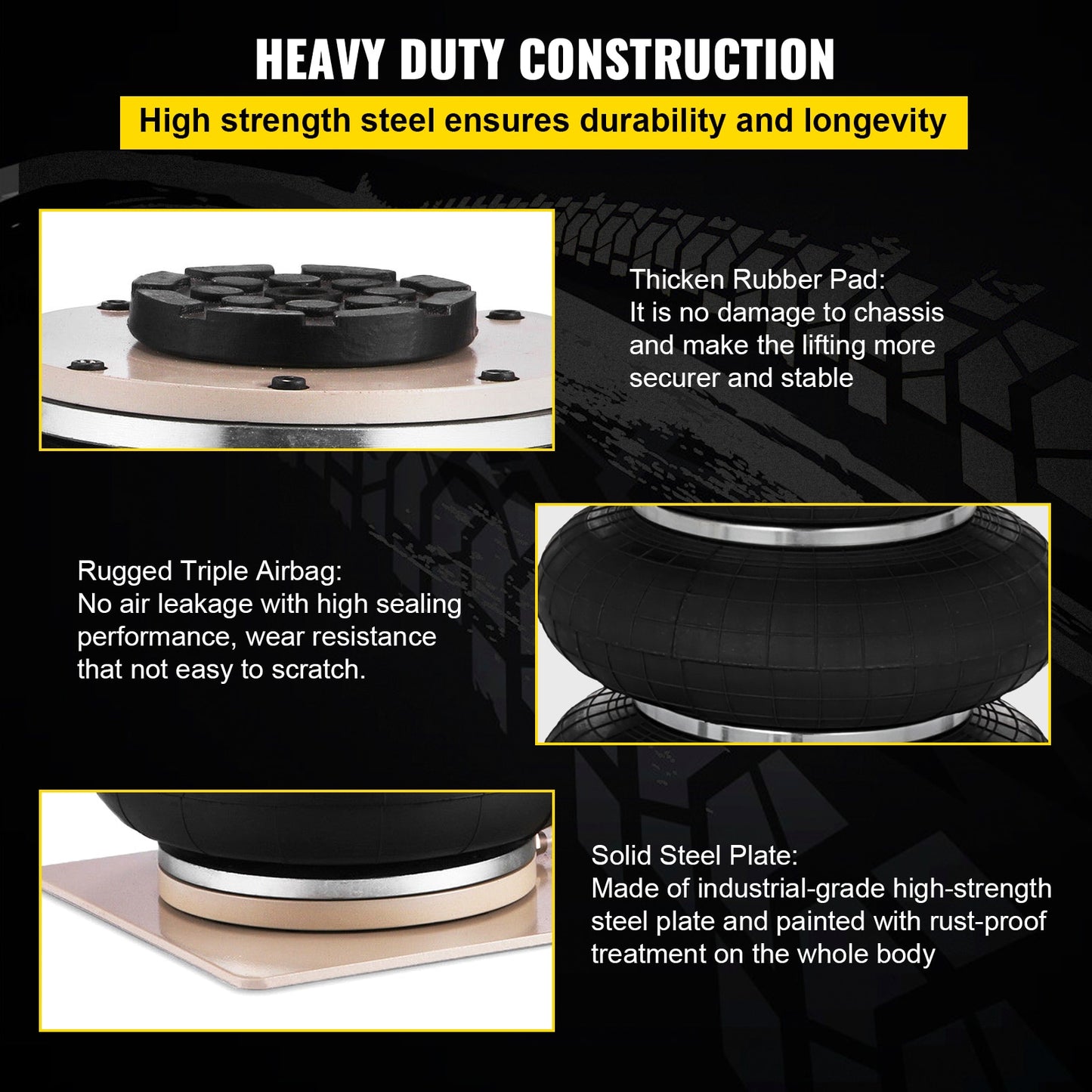 Robust Construction: Crafted from high-strength steel, our pneumatic jack ensures durability and sturdiness. The steel frame is coated with a protective layer and paired with rubber components to minimize impact. The airbags are meticulously sealed, guaranteeing no leakage or damage. Its larger stressed area offers stability even on soft surfaces.