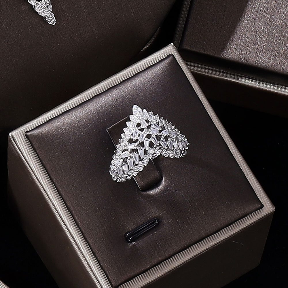 This elegant set includes a necklace, bracelet, ring, and a pair of earrings, all carefully crafted to ensure comfort and durability. The clavicle chain style of the necklace sits delicately on your collarbone, enhancing your neckline while the matching bracelet and earrings add an extra touch of glamour. This complete jewelry ensemble is designed specifically for women who wish to shine on their special day.