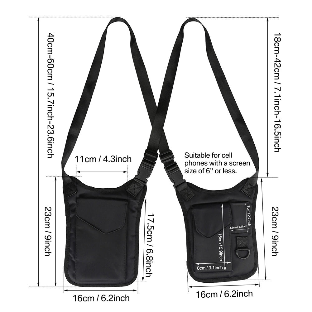 Innovative Anti-Theft Design: Elevate your security with this cleverly designed underarm holster bag. Conceal your valuable items beneath your jacket to outsmart pickpockets. Equipped with five pockets of varying sizes, it accommodates essentials like cellphones, wallets, keys, pens, passports, cash, earphones, glasses, mini LED flashlights, and more.
