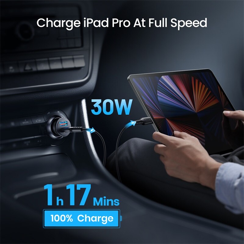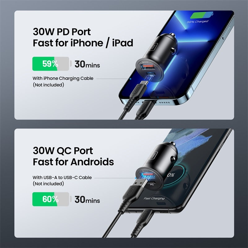 Car Charger 2: 30W USB C + 18W USB A Ports Car Charger