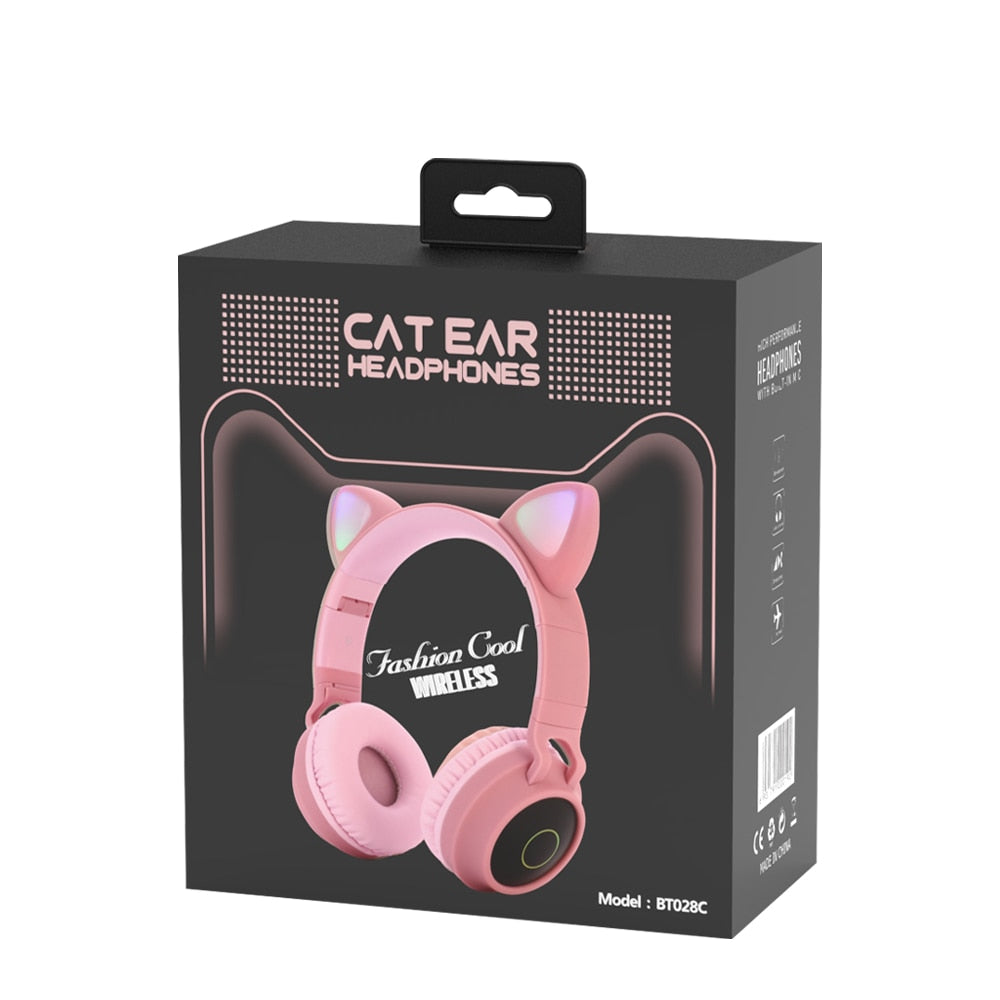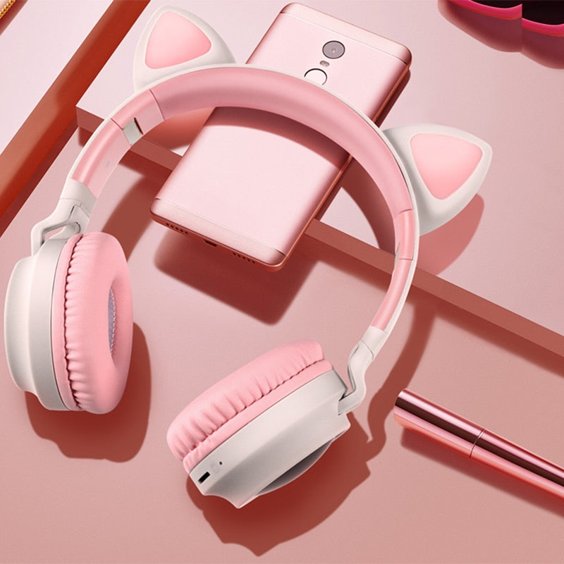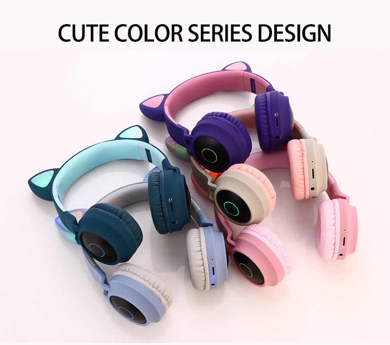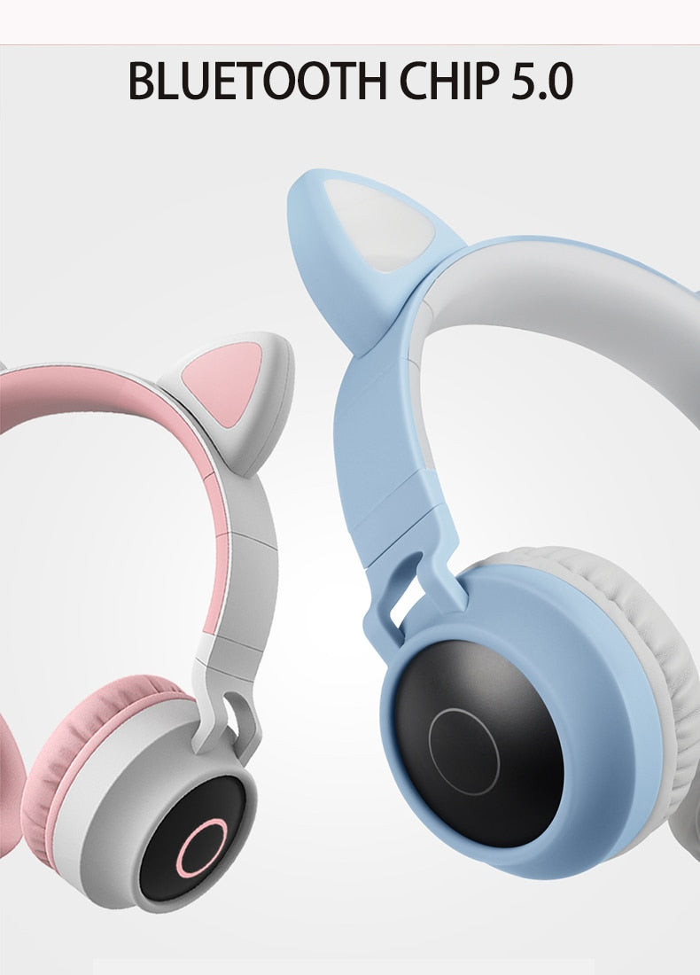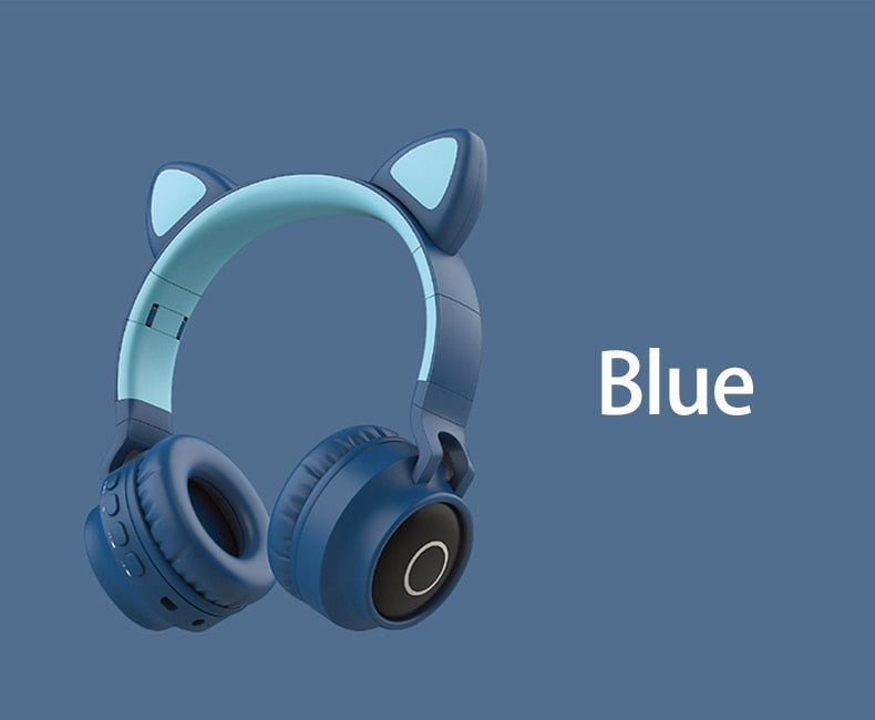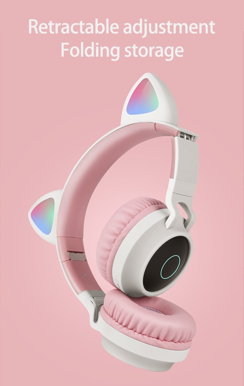 LED Light Wireless Headset with Cat Ear Design - Music Headphones for Girls, Daughters, Bluetooth Headset with TF Card Support and FM Radio