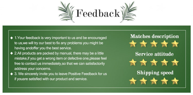 Your feedback holds significant value to us. Our utmost priority is to provide you with the best service possible and address any issues you may encounter. As our products are manually packed, occasional minor errors may occur. If you receive an incorrect or defective item, please contact us promptly so that we can promptly assist you. If you are content with your order and our service, we would appreciate it if you could leave positive feedback with 5 stars.