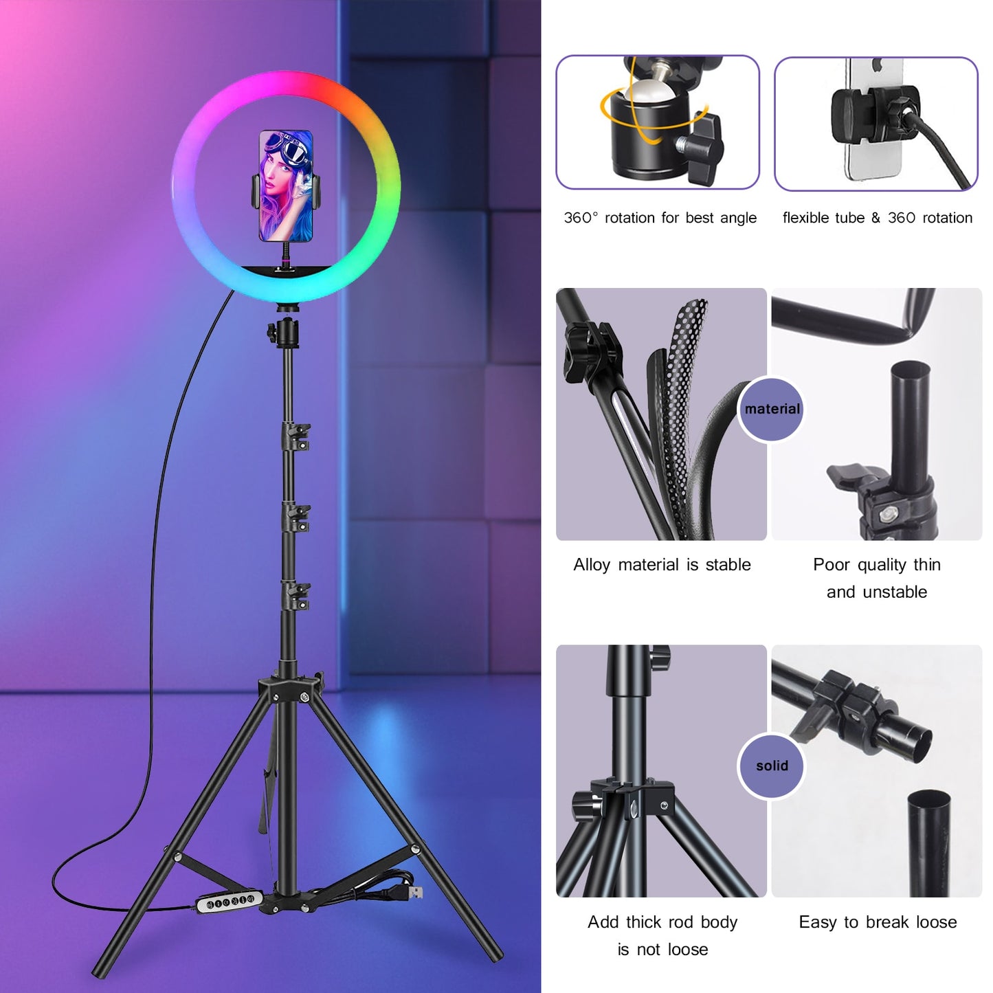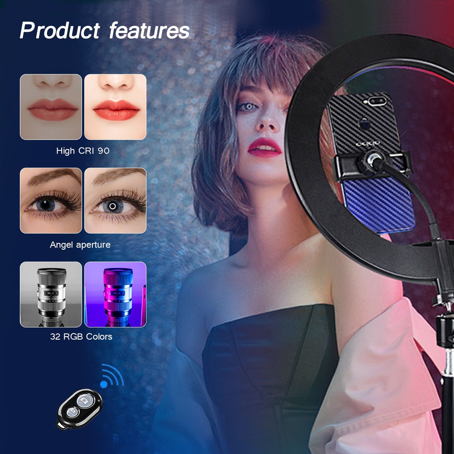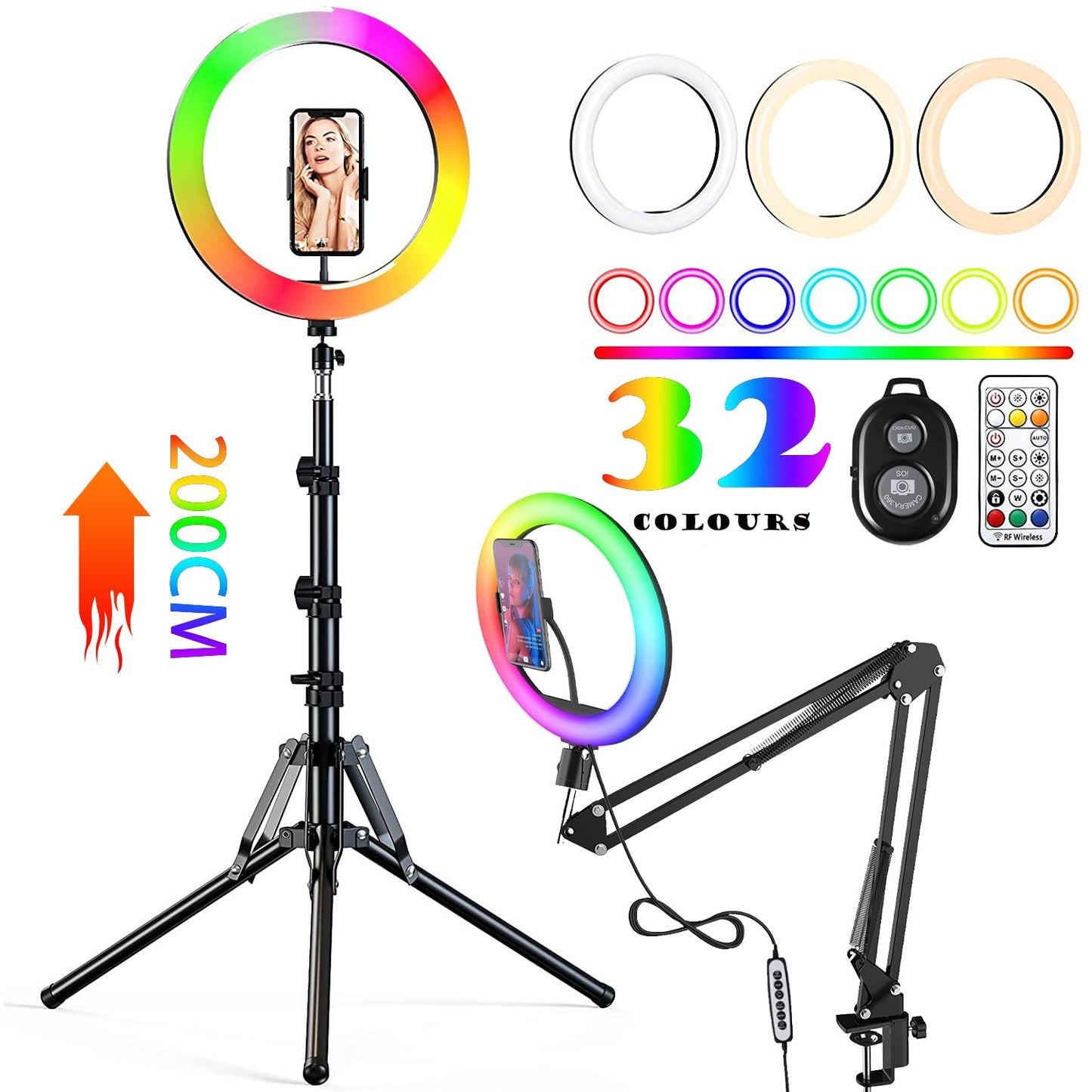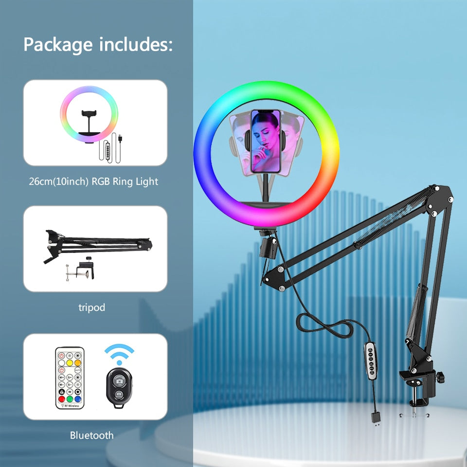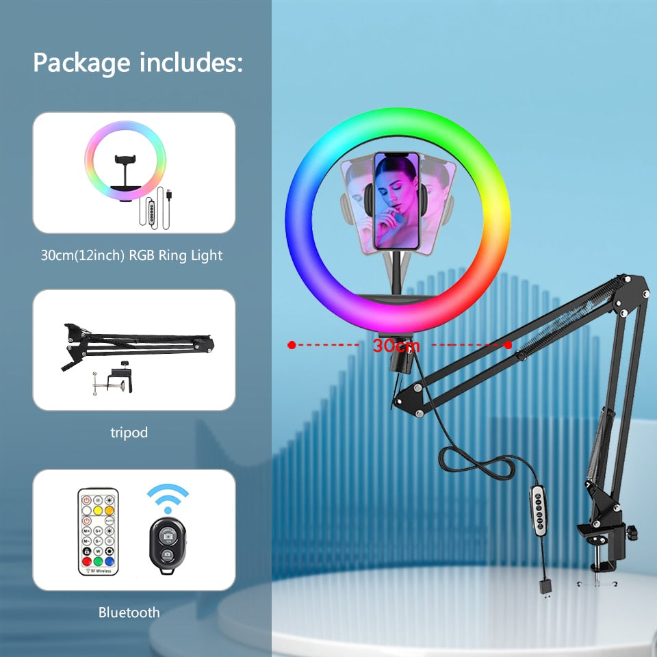RGB Color Soft Ring Light With Desk Long Arm Tablet Tripod Photography Lighting Selfie RingLight Circle Lamp Phone Holder Stand