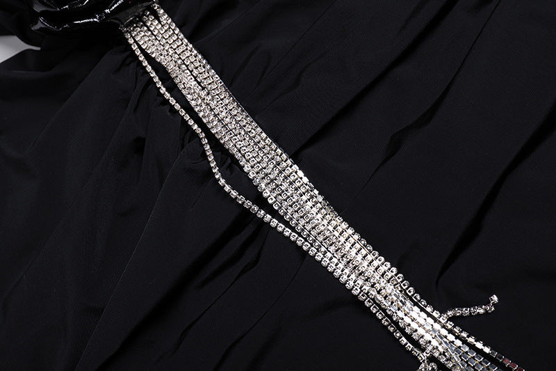 Introducing the Sexy Backless Black Long Sleeve Hollow Flower Tassel Decoration Dress, a stunning piece that combines elegance with a touch of allure. This dress is designed for the modern socialite who wants to make a bold statement. Its backless silhouette not only emphasizes your curves but also gives a daring peek of skin that’s sure to turn heads at any gathering.