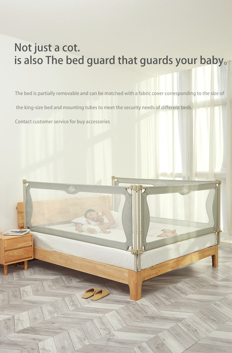 A bed with two uses ---- this cot baby can be used until 0-3 years old, baby grows up can be changed into a Bed fence, depending on the size of the bed, in addition only need to buy two sides of the fence, we will give you an extension pole and cloth cover, the side of the cot can become 1.8 m or 2 m bed fence, can be used until the baby 6 years old! Please contact our customer service for details