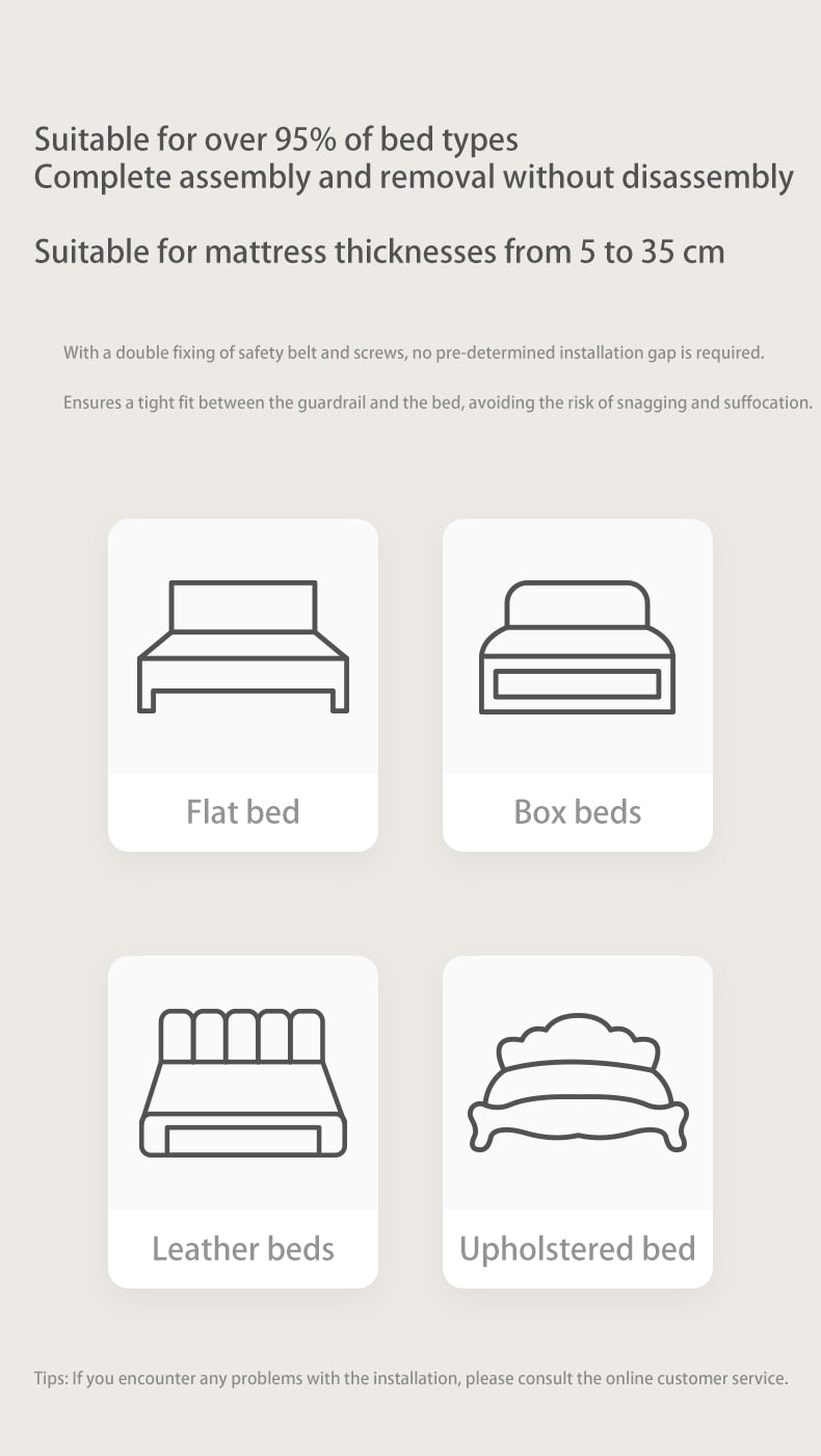 Suitable for more than 95% of bed types, such as common: flat beds, box beds, leather beds, and upholstered beds can all be installed.