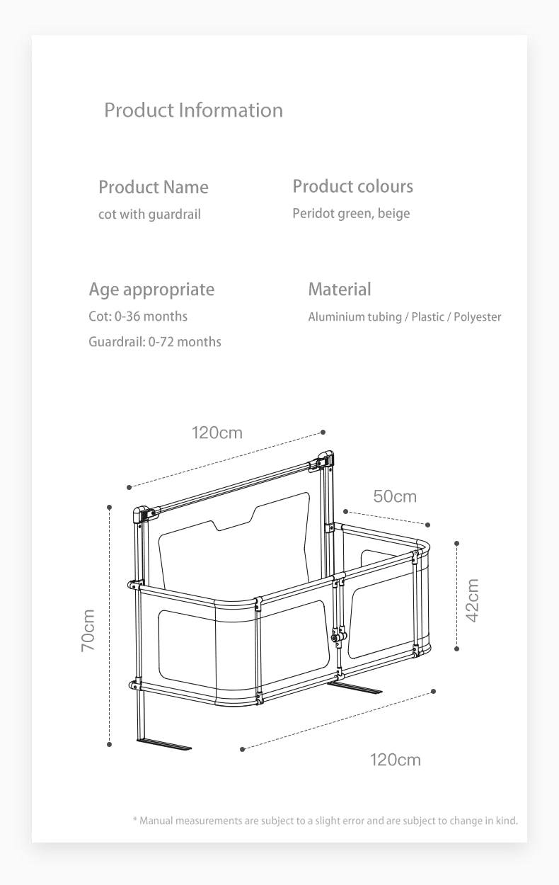 The bed size is 120cm * 42cm * 50cm, with a guardrail height of 70cm.