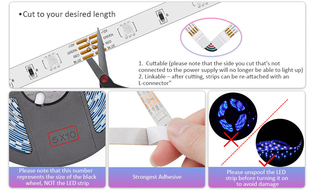4. Please note that the "5X10" on the black wheel represents the size of the wheel, not the LED strip.