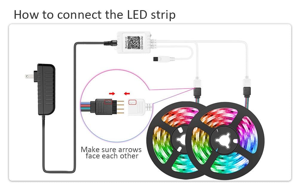 1. When hooking up the light strip to a controller, please make sure the arrows on the connectors face each other and are aligned.