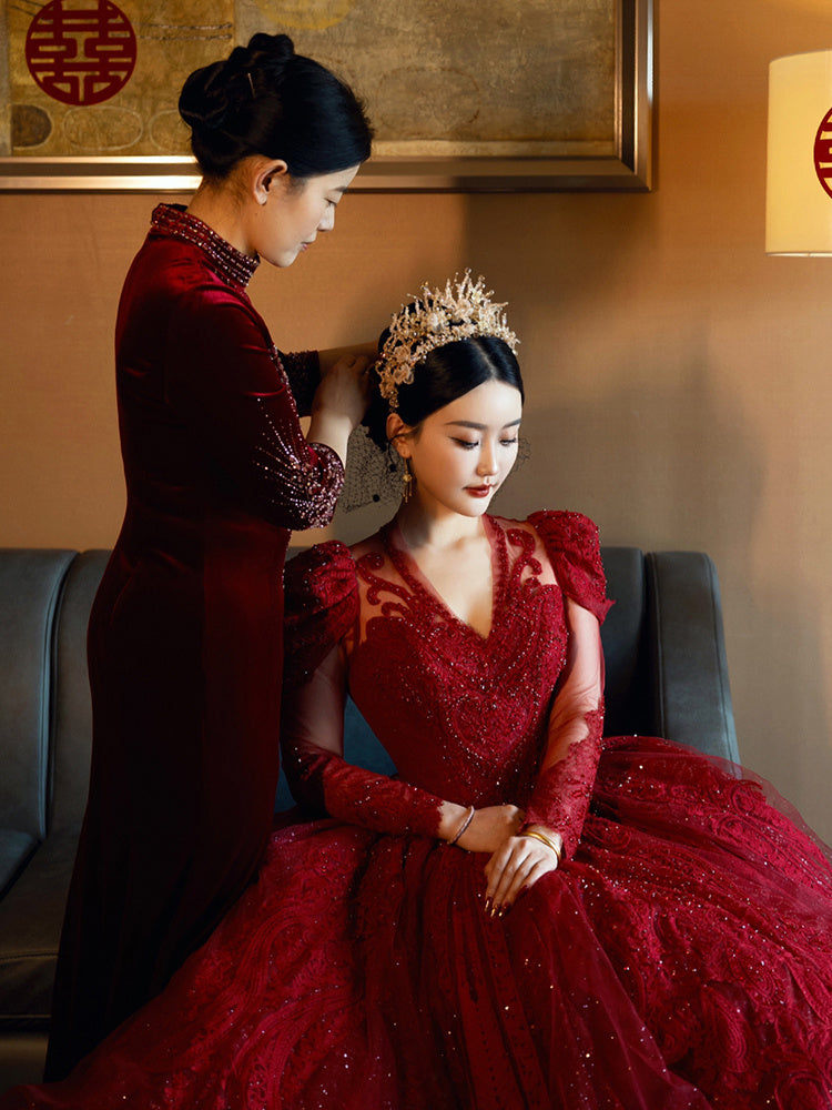 The exquisite lace fabric creates a romantic atmosphere, while the off-shoulder collar design adds a modern twist. This dress showcases your beautiful silhouette with its flattering middle-waisted fit. Drenched in a bold and eye-catching red, this gown ensures all eyes are on you as you glide down the aisle or dance the night away.